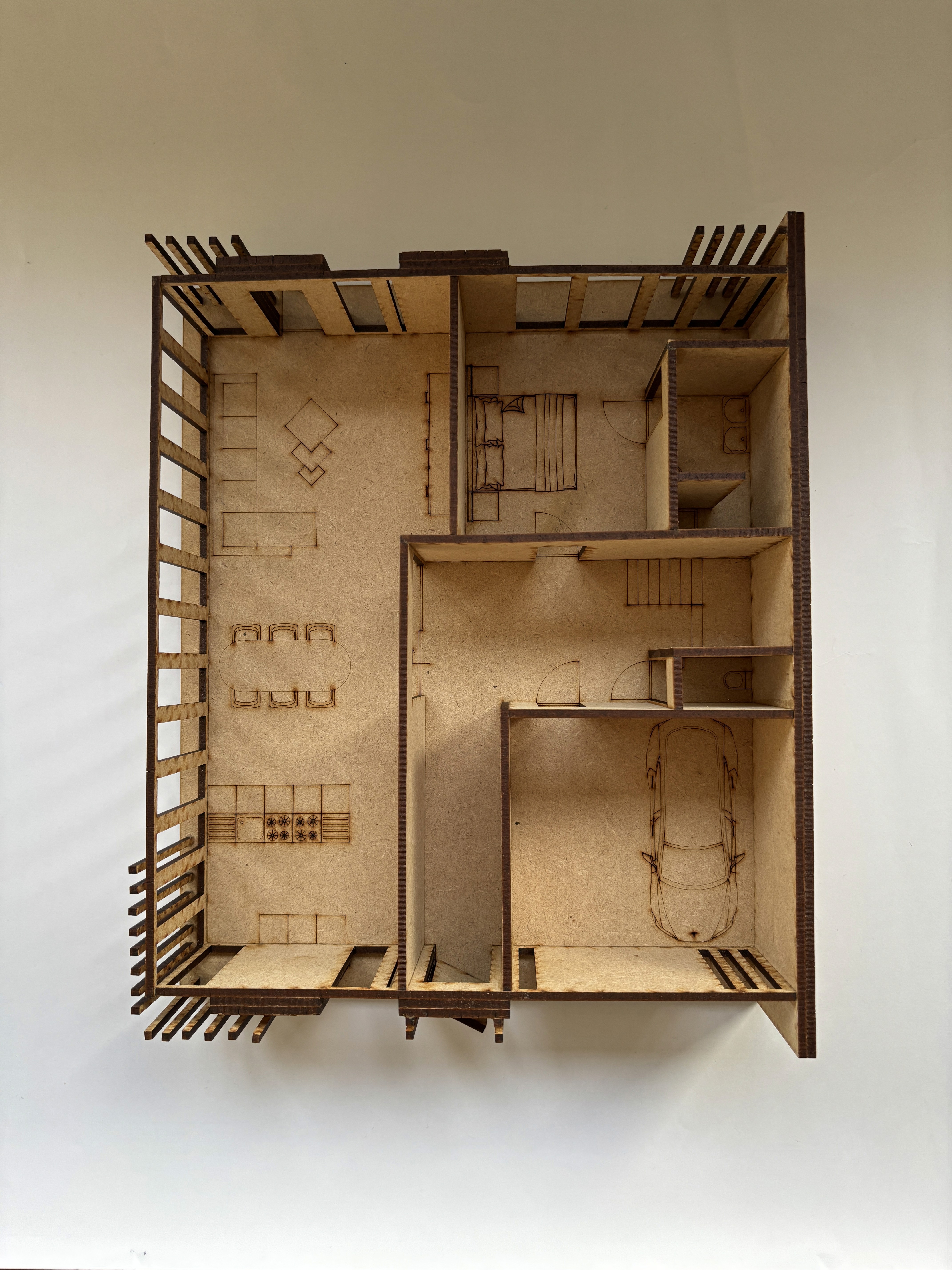 The final result was a complete residential design package, including sketches, Revit drawings, renderings, and a detailed wooden scale model produced with the laser cutter to accurately represent the final design. The project successfully delivered a concept that reflects the client’s requests while demonstrating sustainable design strategies.