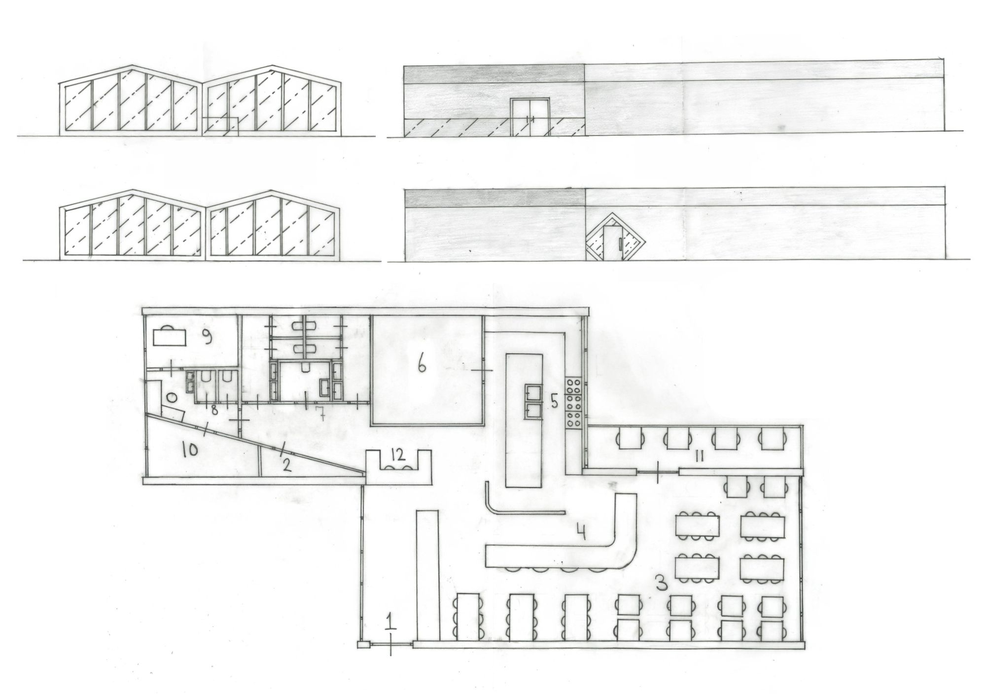 The final result is a restaurant design that combines a high‑end architectural identity with a clearly developed structural concept. The project includes concept sketches, structural drawings, a basic structural SketchUp model, and AutoCAD floorplans and façades. The design presents a modern interpretation of Herzog & de Meuron’s style while meeting the functional and atmospheric requirements of a Michelin‑level restaurant.