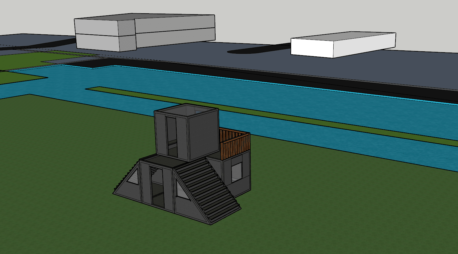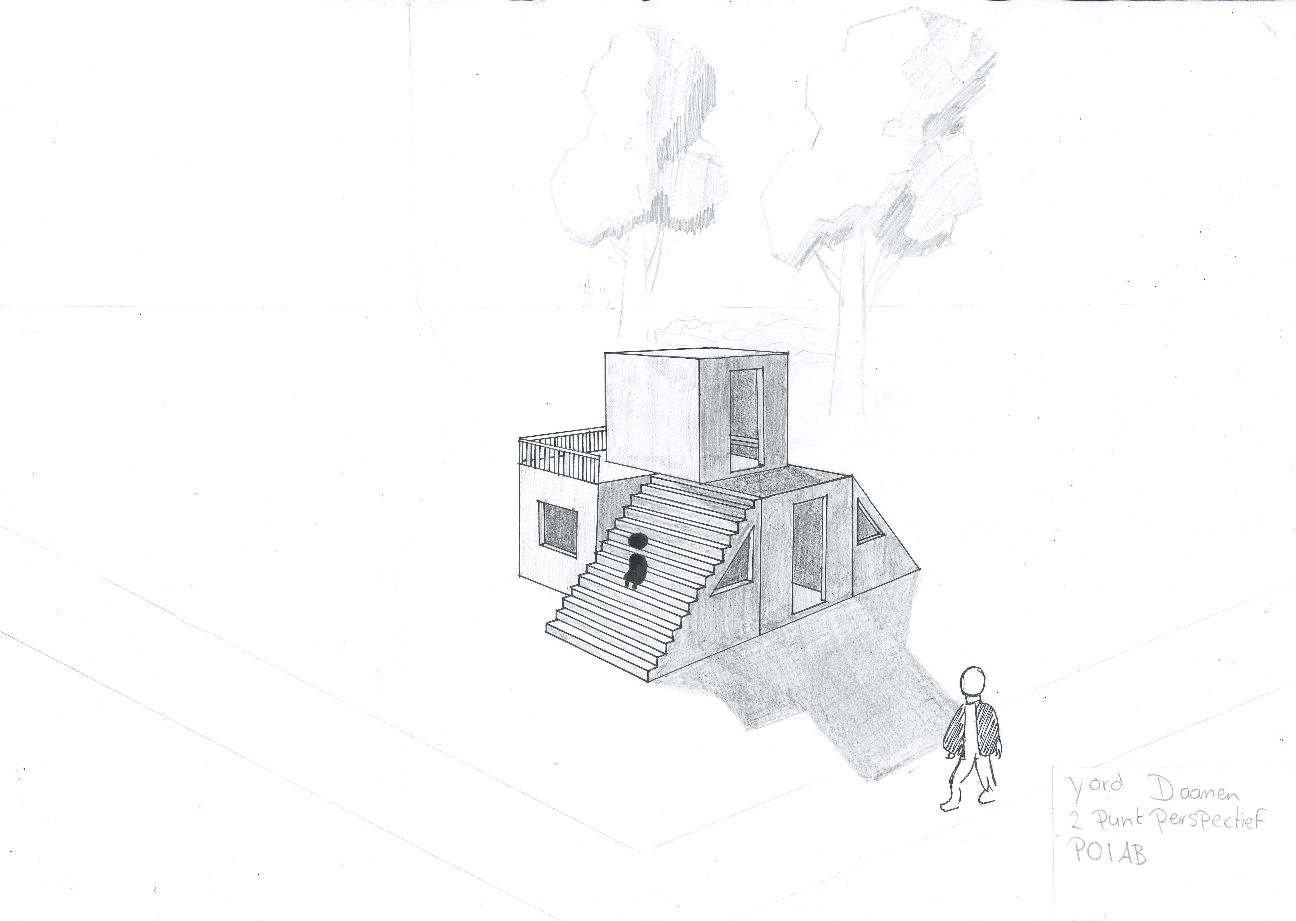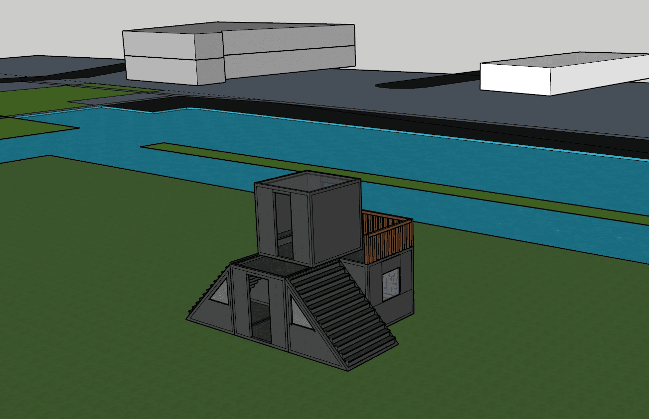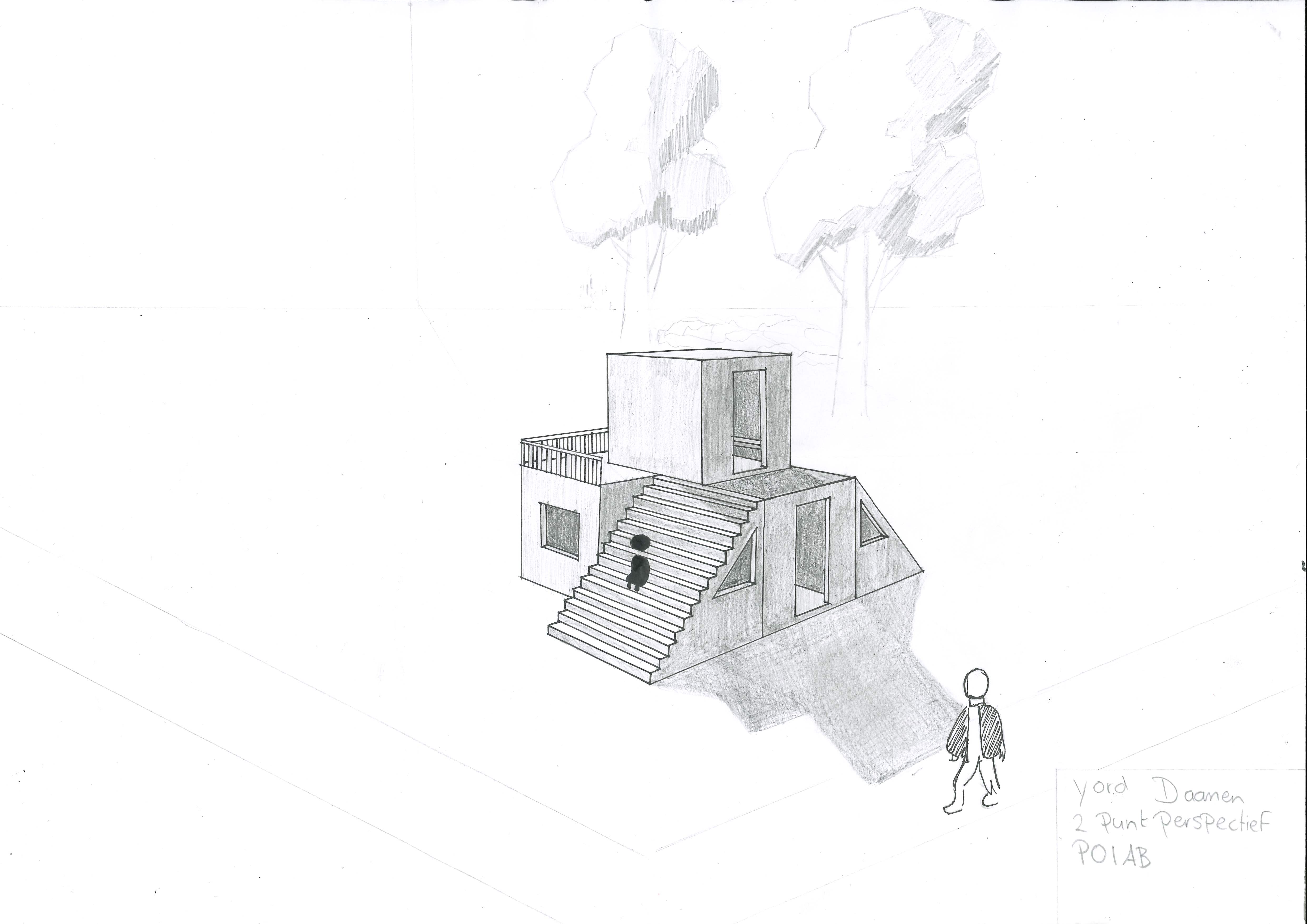 I began the project by exploring different arrangements of the five required cubes through small clay models, which helped identify strong compositions in terms of openness, height, and interaction. From these studies, I selected the best options and developed three schakeling‑schetsen to test the spatial flow. Each variation was then translated into simple mass models in SketchUp, allowing me to compare proportions and usability. After choosing the most convincing concept, I refined it with a two‑point perspective drawing and began developing the structural system in SketchUp, including wind bracing and material tests. The project concluded with a fully detailed SketchUp model that combines form, structure, and atmosphere into a functional hangout space for teenagers.