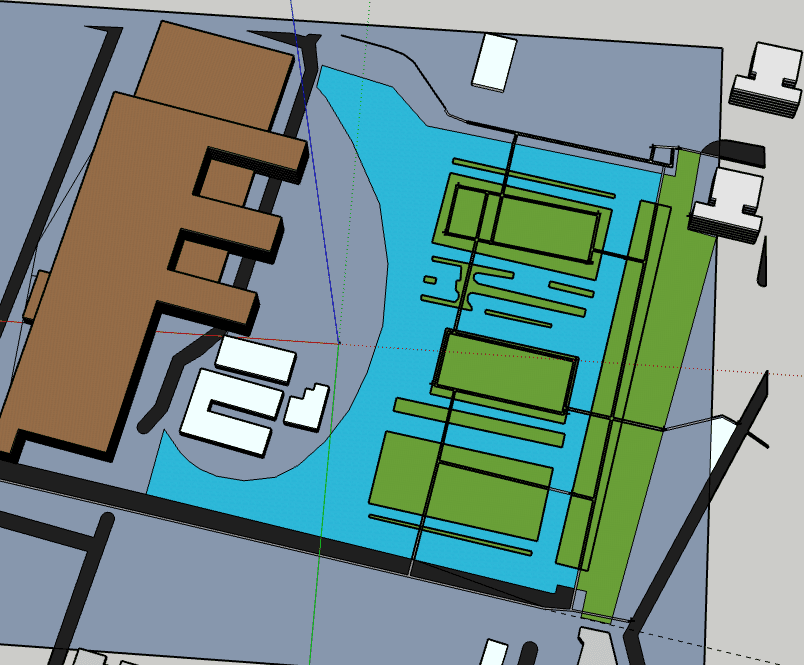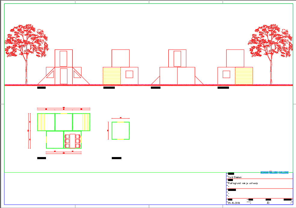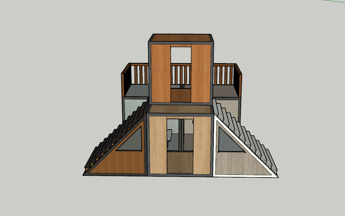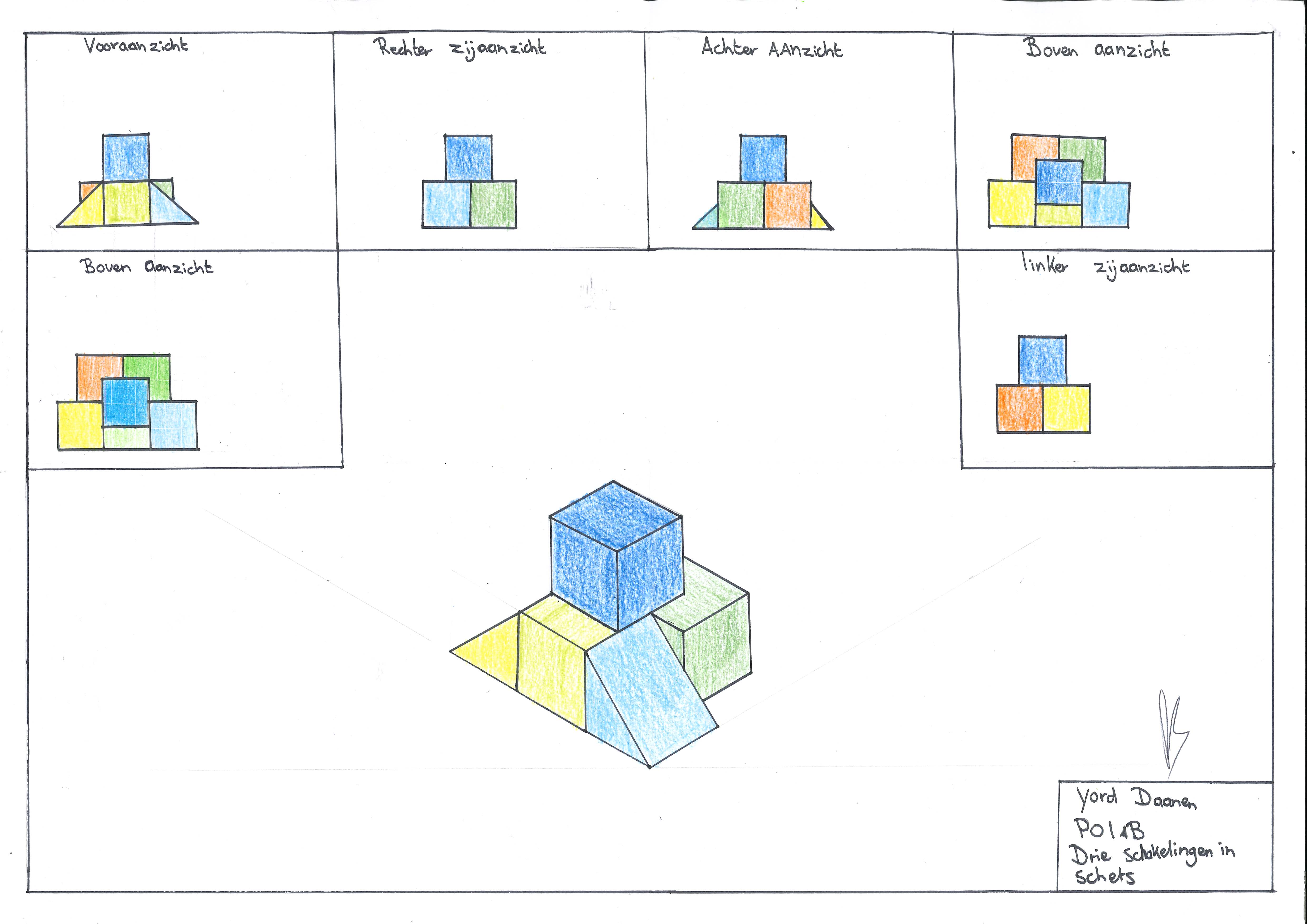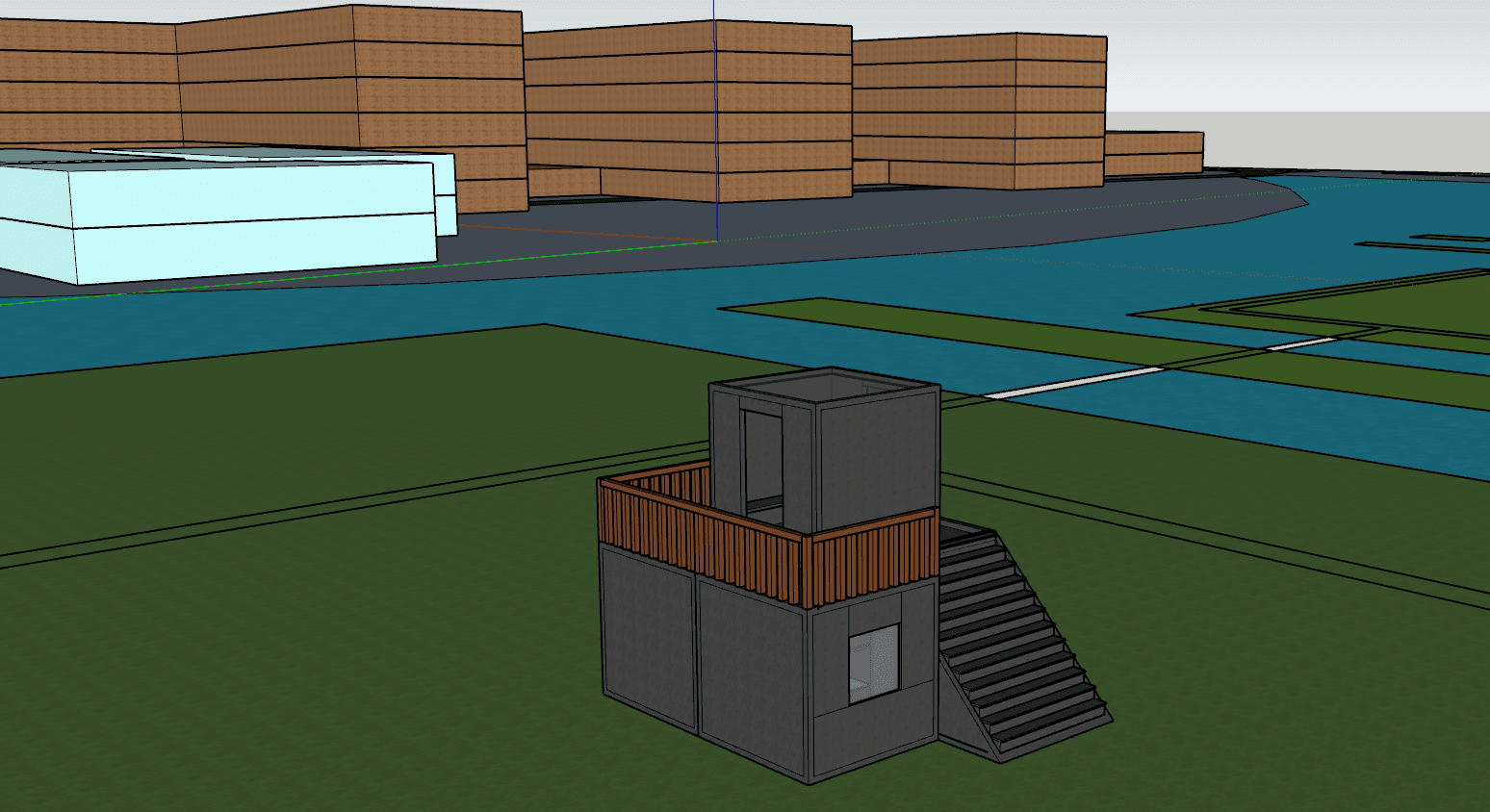 I began the project by exploring different arrangements of the five required cubes through small clay models, which helped identify strong compositions in terms of openness, height, and interaction. From these studies, I selected the best options and developed three schakeling‑schetsen to test the spatial flow. Each variation was then translated into simple mass models in SketchUp, allowing me to compare proportions and usability. After choosing the most convincing concept, I refined it with a two‑point perspective drawing and began developing the structural system in SketchUp, including wind bracing and material tests. The project concluded with a fully detailed SketchUp model that combines form, structure, and atmosphere into a functional hangout space for teenagers.